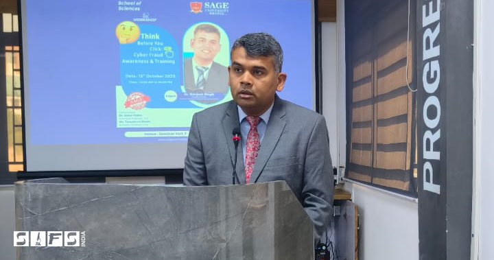 Workshop “Think Before You Click: Cyber Fraud Awareness & Training” at the School of Science, SAGE University, Bhopal. Dr. Ranjeet Singh shared valuable insights with UG and PG students about cyber forensic tools, mobile forensics, real-life case studies, fraud prevention techniques, and career pathways in cyber forensics. The session was filled with curiosity and interaction, as students learned practical ways to detect digital threats and ensure safe online practices. The workshop served as a strong step toward building cyber awareness and empowering the next generation of digital defenders. [13.09.2025]
